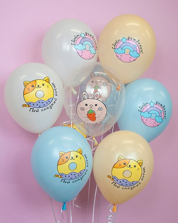 Шары с шелкографической многоцветной печатью и оригинальными дизайнами станут идеальным украшением праздничного торжества и поднимут настроение в любое время года.
